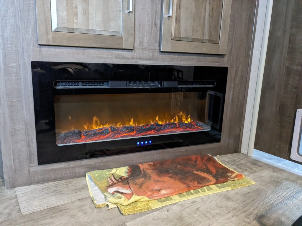Besides the propane heater, we also have an electric fireplace. This is our main source of heat when we’re hooked up to power. Just a few minutes with this thing on, and the whole camper is nice and toasty! Plus I really enjoy the flames. In the bedroom we have a small space heater that we turn on sometimes to take the chill out of the air when getting up in the morning.