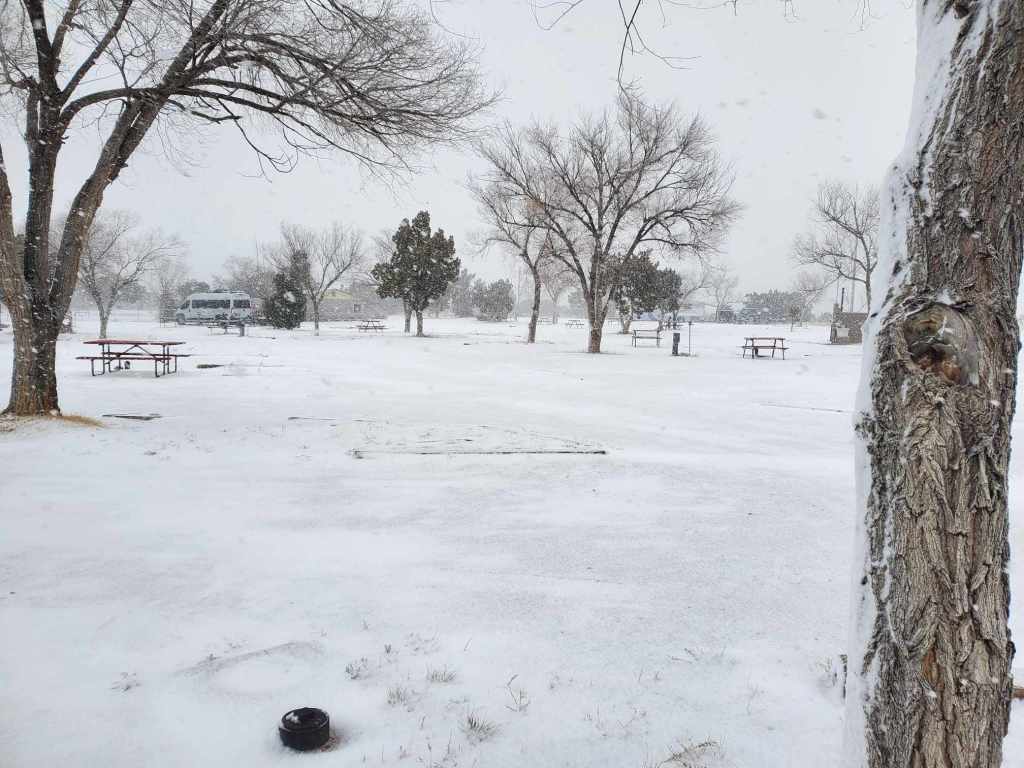 Hey y’all! It’s January, and in many parts of the country it’s cold and snowy. Currently, we’re camping an extra day in New Mexico due to yesterday’s winter storm warning in northwest NM and today’s snow and high winds east of Albuquerque. Today’s snow day has me reflecting on how we stay warm and cozy in freezing temperatures when we have full hookups and even when we don’t!