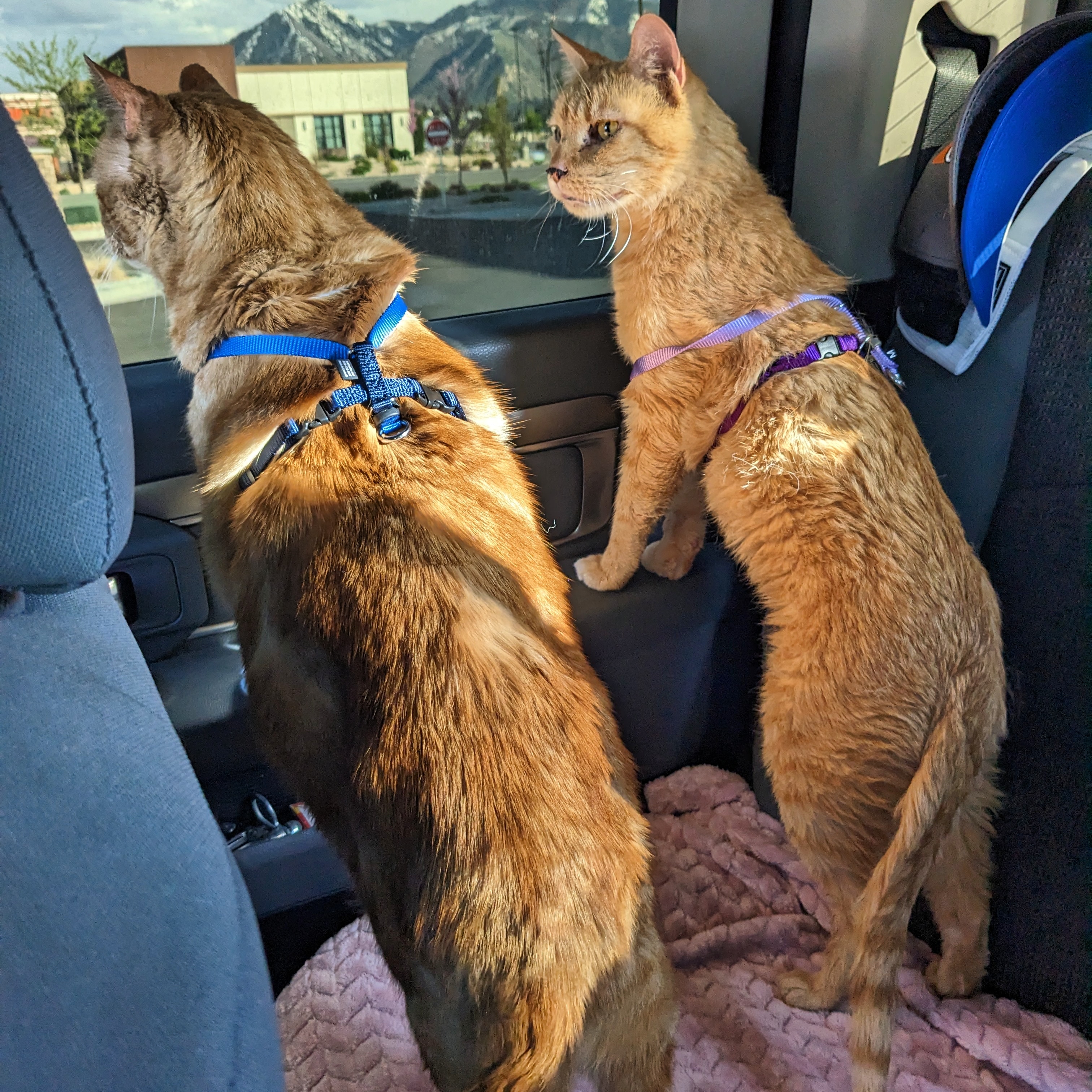Our cats can handle up to 6 hour travel days (longest we’ve been with them so far), but we prefer to keep in under 5 hours and with a lunch break if it’s over 3 hours. We tend to stop in Walmart parking lots for lunch because we can push the slides out and toss the cats in to let them use the bathroom, eat, and hydrate. I’ve tried bringing food and water with us on travel days, but they don’t seem to want anything other than treats. They’ll eat the treats no problem though! If you’re worried about accidents, I’d recommend getting seat covers for the back seats and bringing a litter box with you. We don’t bring the litter box, but we do have the back seat covers, just in case.